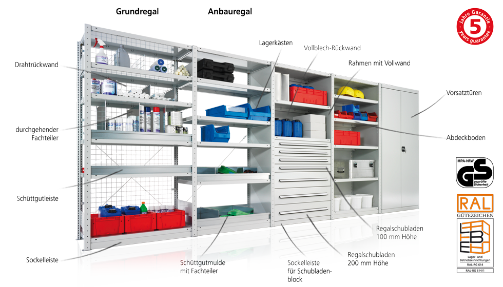 Je nach Anforderung lassen sie sich jederzeit auf- und umrüsten und passen sich dem Lagergut damit optimal an. Eine Vielzahl von Zubehör schafft zahllose Varianten und eine Reihe von Speziallösungen, wie beispielsweise Schrägbodenregale, Regale mit Sichtlagerkästen, Reifen- und Felgenregale und Regale für Gefahrenstoffe.